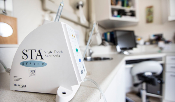 The STA Single Tooth Anesthesia® System instrument is a computer assisted system for local anesthesia. The instrument carefully guides dental professionals as they perform injections